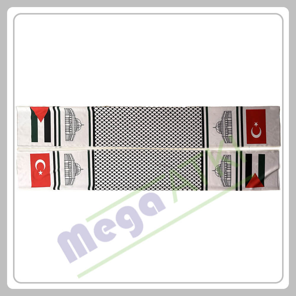 Dijital baskılı şal saten atkıya renk sınırlaması olmadan her türlü logo ve fotoğraf uygulanır.